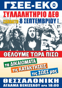Ο ΣΠΑΡΤΑΚΟΣ καλεί όλους τους εργαζόμενους, τους συνταξιούχους και τους ανέργους στο μεγάλο εργατικό και κοινωνικό συλλαλητήριο το Σάββατο 8 Σεπτεμβρίου 2018 ώρα 18.00 στο Άγαλμα του Βενιζέλου στη Θεσσαλονίκη και στην πορεία διαμαρτυρίας που θ’ ακολουθήσει.